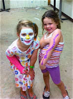 Thankfully our guests helped to keep the girls out of too much trouble, although the gaps between departures and arrivals were just enough time to test the limits. For instance, there was the afternoon I walked into the downstairs bathroom to find our own little wine vat going on in the sink. Abby had decided to make grape juice with a bag of Concord grapes by squeezing them in the lemon press and discarding the remaining skins, membranes and seeds in the sink (which, of course were left there while she no doubt was off sipping her 1/4 cup of juice). And then there was her parachuting off a chair over the stairs with a grocery bag... Ellie thinks she's a cosmetologist, finding mine and others' make-up and expressing herself quite freely. Her favorite face moisturizer is either mine or Adam's deodorant. I often find her with triple-wide shimmery pink lips and not just once have found her with dark brown eyeshadow filling in her eyelids, cheeks, forehead, chin... This morning, in fact, Abby notified me that Ellie was using some black eyeliner and in the rush of getting them both out the door, I failed to perform a face-check. After Ellie came home from preschool, a friend of mine asked if Ellie had a black eye. I suddenly remembered. Oh well. I also decided, between visitors, that Abby should learn how to ride a bike sans training wheels - and while Abby was working at it, Ellie might well as try too. I'm not exactly sure whose handle bars left the several white scratches on either side of the car, but hey - Abby can ride a two-wheeler! (Ellie's still working on it.) Never a dull moment 'round here.